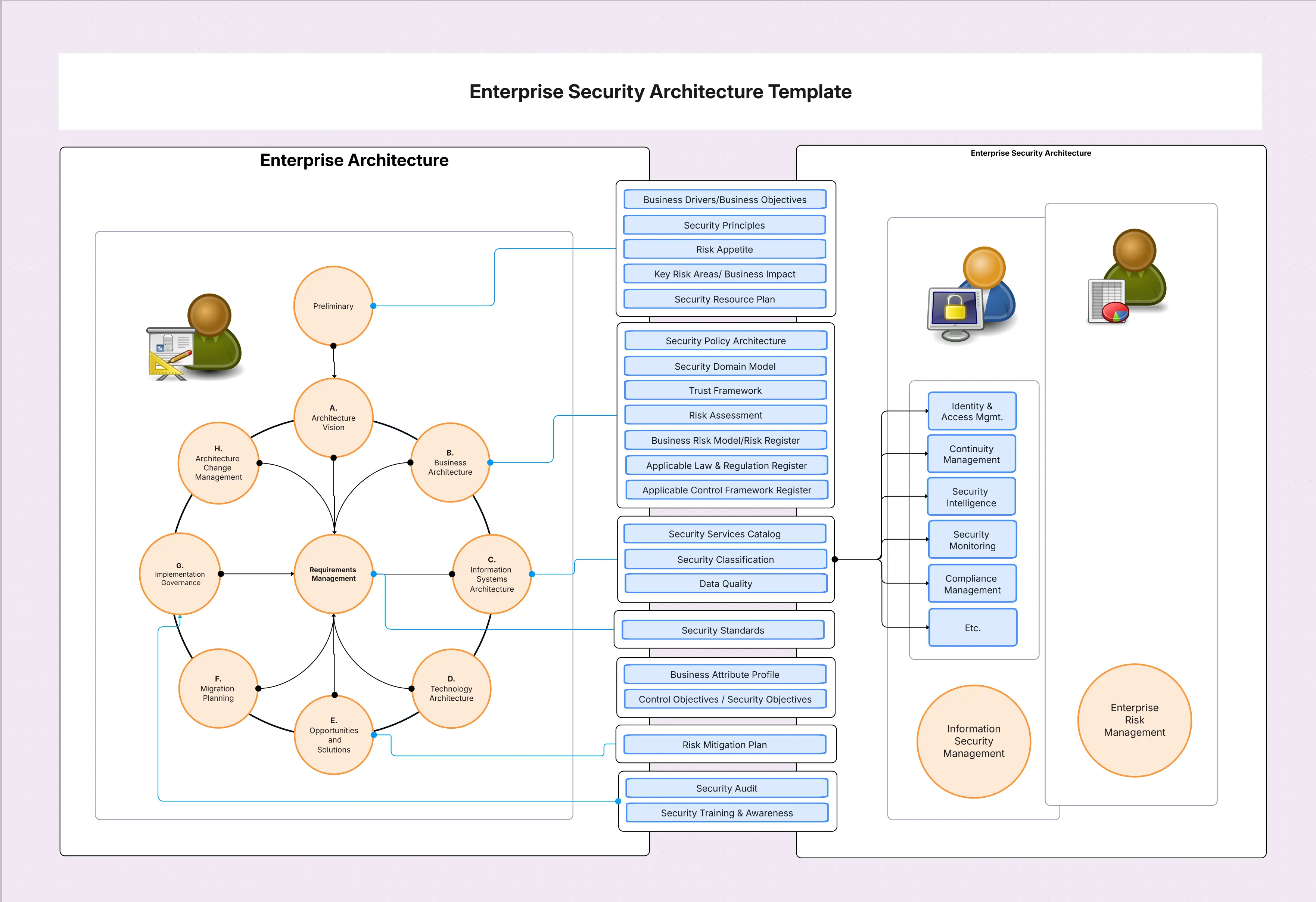 Model the target state with the Enterprise Security Architecture Template inside the Security Architecture Diagram Tool. Deep-link to Zero Trust, IAM, Network Security, Security Monitoring, and Hybrid Cloud Security.